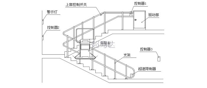 斜掛式輪椅升降平臺,一種安裝在樓道系統(tǒng)利用電機(jī)牽引沿著軌道上下移動并運(yùn)載乘客的無障礙安全裝置。它由驅(qū)動系統(tǒng)、導(dǎo)軌、繩輪鏈、移動平臺等組成。用于建筑樓道系統(tǒng)中,乘坐輪椅或爬樓梯困難的人員攀爬樓梯的專用設(shè)備。主要由主驅(qū)動系統(tǒng),輔助驅(qū)動系統(tǒng)、主控系統(tǒng)和安全系統(tǒng)組成。