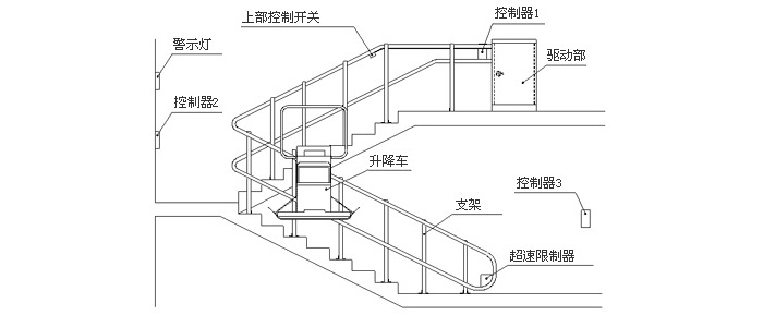 斜掛式輪椅升降平臺(tái),一種安裝在樓道系統(tǒng)利用電機(jī)牽引沿著軌道上下移動(dòng)并運(yùn)載乘客的無(wú)障礙安全裝置。它由驅(qū)動(dòng)系統(tǒng)、導(dǎo)軌、繩輪鏈、移動(dòng)平臺(tái)等組成。用于建筑樓道系統(tǒng)中,乘坐輪椅或爬樓梯困難的人員攀爬樓梯的專用設(shè)備。主要由主驅(qū)動(dòng)系統(tǒng),輔助驅(qū)動(dòng)系統(tǒng)、主控系統(tǒng)和安全系統(tǒng)組成。
